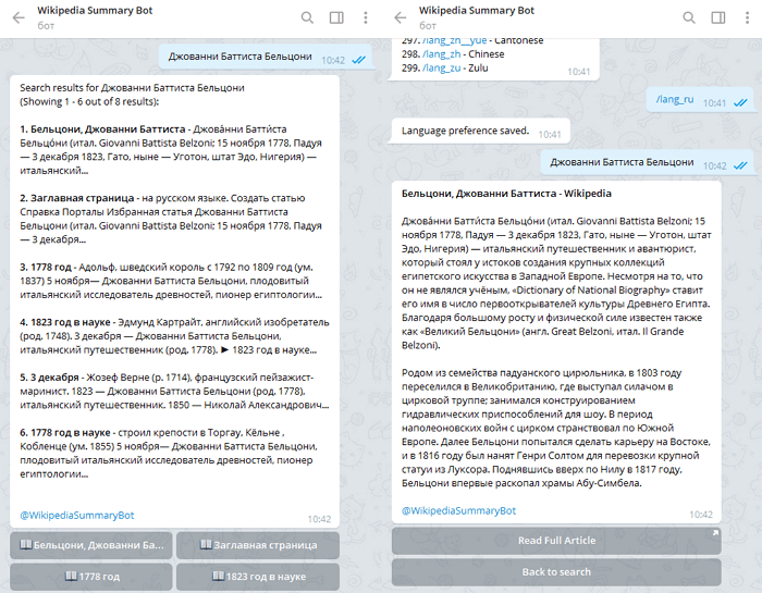 Скільки разів ви цитували сторінку з Вікіпедії, щоб виграти суперечку з друзями? Я думаю, що багато. Wikipedia Summary дозволяє швидко дати посилання на статтю в чат разом з короткою витримкою. А також бот дає посилання на повну статтю внизу повідомлення, для більш докладного вивчення. У налаштуваннях можна вибрати мову для майбутніх відповідей.