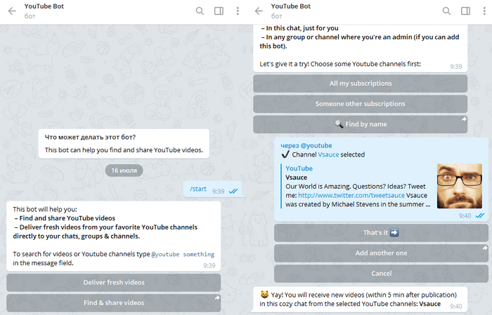 Дивитися відео з YouTube тепер можна не виходячи з Telegram — це стало реально, завдяки Youtube Bot. За замовчуванням він показує користувачам трендові ролики. Але ви можете легкої знайти потрібний YouTube-каналу за назвою. Також бота можна синхронізувати з аккаунтом, щоб відобразити списків ваших підписок на відеохостингу. YouTube Bot можна додати у ваш канал або групу в Telegram, щоб у учасників з'явився ще один спосіб розважитися.