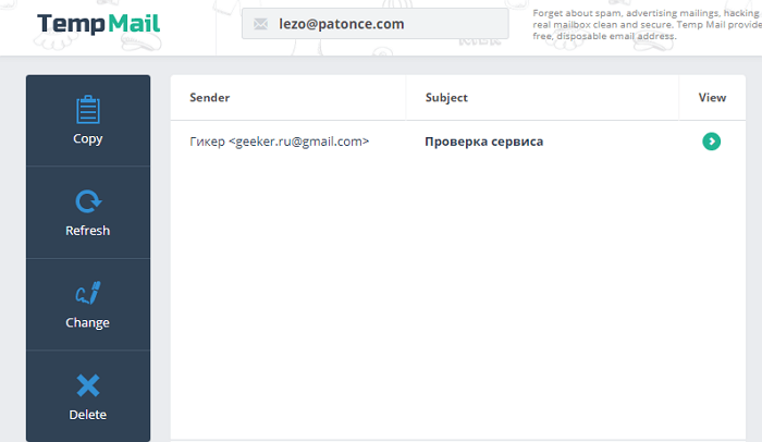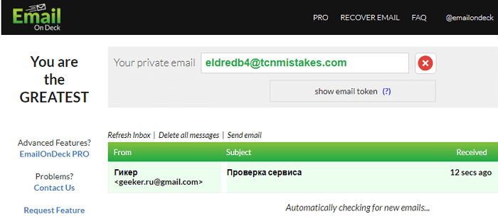 EmailOnDeck— цей сервіс тимчасової електронної пошти надає користувачеві унікальну адресу. Ви можете використовувати його для реєстрації на різних сайтах. Віддалений адресу можна відновити. Для цього використовуйте токен відновлення. Але отримані листи видаляються назавжди.