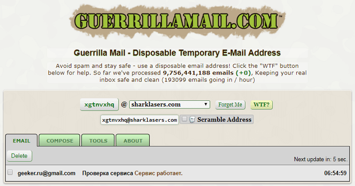 Всі електронні листи, отримані в Guerrilla Mail, видаляються рівно через 60 хвилин. Для використання сервісу реєстрація не потрібна. Користувачі можуть вибирати аліаси та домени. Корисна особливість Guerrilla Mail – можливість відправляти листи з будь-якою адресою. IP-адреса відправника автоматично додається до повідомлення. Це зроблено для запобігання зловживання послугою. Також є мобільний додаток для Android, яке можна завантажити з Google Play.