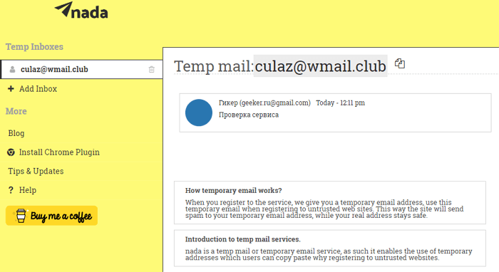 Сервіс одноразової пошти Nada був створений розробниками email-клієнта AirMail. Ця зручна служба для реєстрації на різних сайтах, якими ви не плануєте довго користуватися. Nada надає тимчасові поштові скриньки для тривалого використання. Вхідні листи зберігаються до тих пір, поки домен залишається активним. У Nada можна використовувати кілька аліасів і комбінацій доменів.