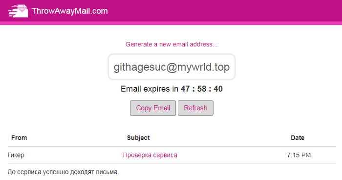 10 Minute Mail надає тимчасовий адресу електронної пошти автоматично видаляється через 10 хвилин після реєстрації. Але цей час можна продовжити або скинути таймер, натиснувши кнопку Refresh. В результаті 10-хвилинний відлік почнеться заново. Такі адреси корисні, якщо ви хочете зареєструватися на невідомому сайті.