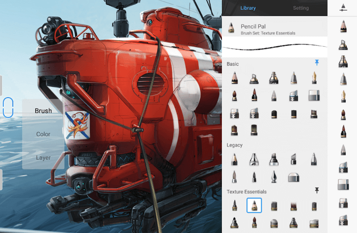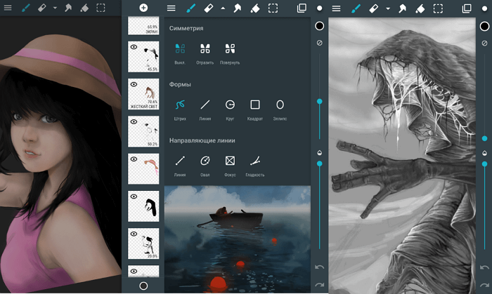 Sketchbook – відмінний вибір для художників, які потребують професійному і зручний інструмент для малювання. Програма має солідний набір функцій. Десять встановлених кистей з тонкою настройкою кожної з них. Масштабування до 2500%, три шари і шість режимів змішування, імітація чутливість до сили натискання.