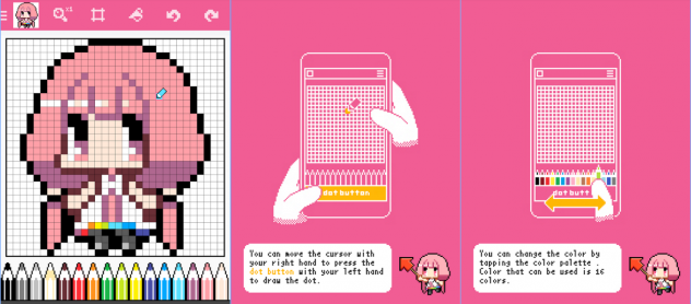 Dotpict – вона призначена виключно для піксельної графіки. Робочий екран відображається у вигляді сітки, кожен квадрат якої можна заповнити певним кольором. Так можна створювати невеликі пейзажі, зображення людей, тварин і т. д.