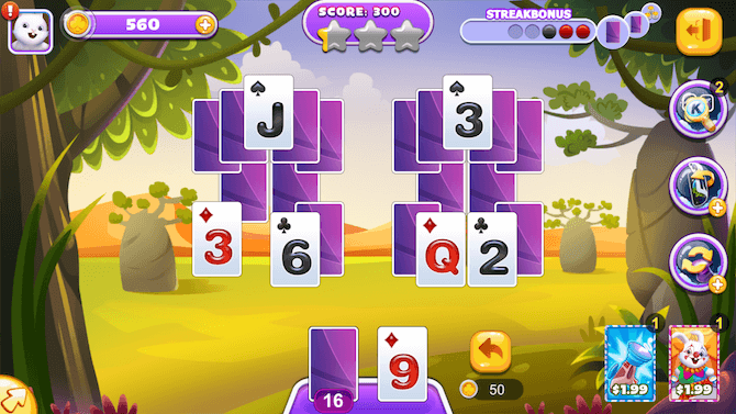 Якщо ви хочете щось складніше, Tri-Peaks Solitaire Story буде непоганим варіантом. Являє собою комбінацію двох видів «Солітера» — «Гольфа» і «Піраміди». Мета в тому, щоб перемістити карти в три стопки. За кожну заповнену «вершину», ви отримаєте додаткові очки. Вибирайте карти, гідність яких на одне значення вище або нижче базової. Якщо ніяких відповідних варіантів немає, просто натисніть на колоду і отримаєте нову карту.