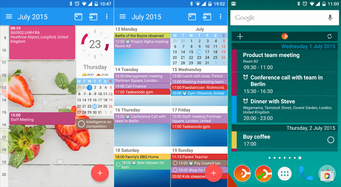 Календар в цьому додатку дуже зручний у використанні. Він відмінно вписується в ОС Android завдяки інтерфейсу Material Design. Можна переглядати події за день, три дні, місяць. Є повідомлення, що попереджають про заплановані справи. Також є віджет з справами на день, який можна розмістити на головному екрані смартфона, щоб завжди бути в курсі важливих справ.
