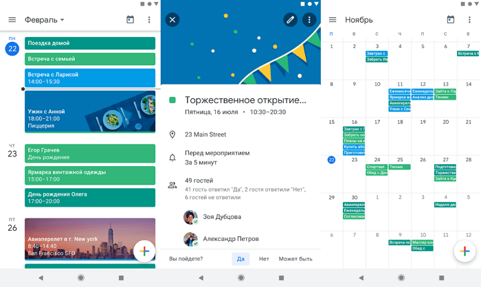Google Calendar інтегрований в екосистему Google. Інструмент автоматично завантажує події, такі як авіарейси або концерти, з Gmail, але при бажанні цю функцію можна відключити. Календар синхронізується практично з будь-якими пристроями, а також працює з персональним помічником Google Assistant. Повідомлення надсилаються на e-mail або SMS.