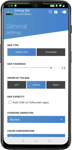 Energy Bar знаходиться прямо над рядком стану, і ви можете налаштувати її товщину та положення. Хоча Energy Bar не вказує відсоток батареї в цифрах, ви можете вибрати функцію, яка буде демонструвати різні кольори при різних рівнях зарядки.
