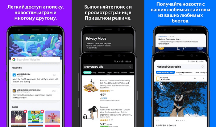 Коли користувач щось шукає в інтернеті, висока ймовірність того, що він натисне на першу посилання. Безкоштовний браузер під назвою Cake враховує цю особливість психології людини, а тому повністю видаляє сторінку пошукової системи. Замість цього ви можете відразу перейти безпосередньо до першого сайту з пошукової видачі, а звідси за допомогою свайпов — на інші сторінки. Доступний і звичайний режим пошуку. Пам'ятайте, що чим нижче рейтинг, тим далі в пошуковій видачі він знаходиться. Cake також попередньо завантажувати посилання, найбільш схожі на відкриту вами.
