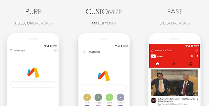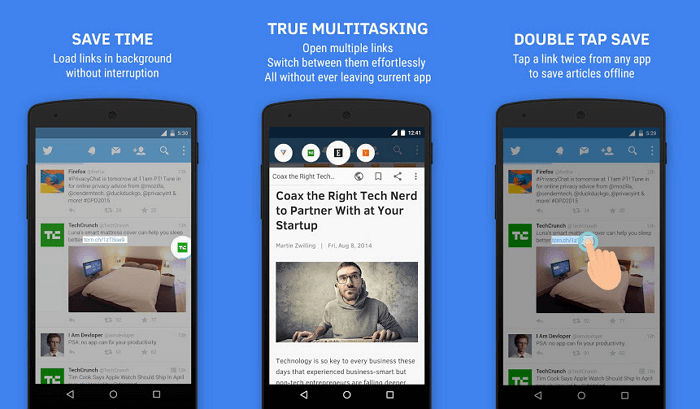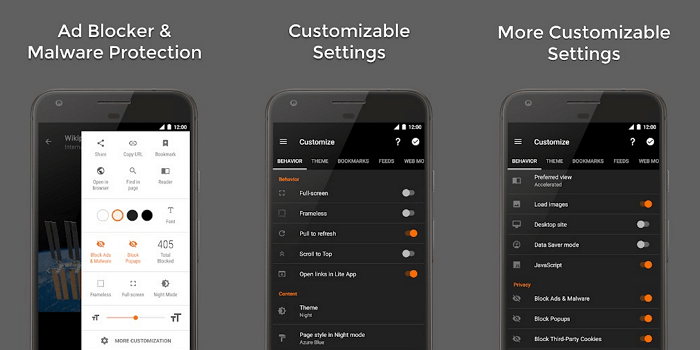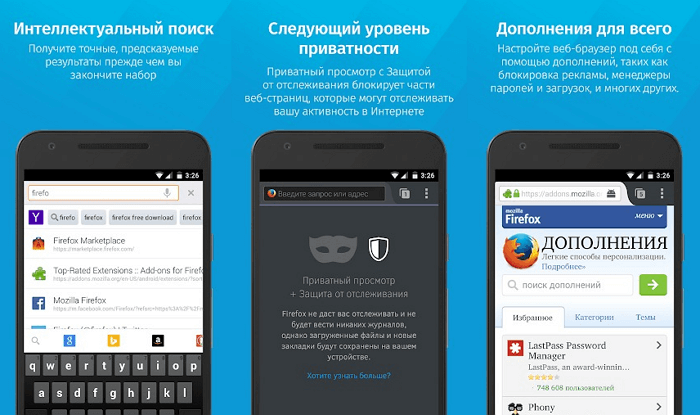 Firefox пройшов довгий шлях з моменту своєї появи на ринку. І в даний час він залишається одним з найбільш просунутих браузерів для Android. Він може похвалитися вражаючим функціоналом, що включає в себе: синхронізувати закладки, історія тощо), забезпечення конфіденційності, легкі у використанні закладки, спільне використання ресурсів, підтримку цифрової трансляції Chromecast, доступ до ряду доповнень і розширень, що поліпшують можливості серфінгу.