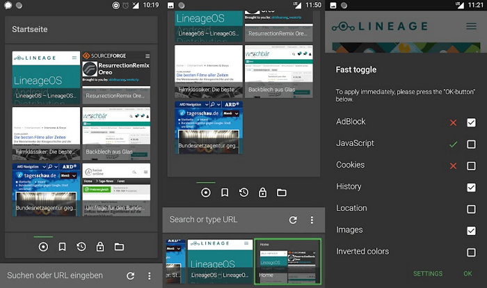 Крім того, браузер оснащений цікавою налаштуванням безпеки. Натисніть і утримуйте кнопку меню для відкриття діалогу швидких переходів. Тут включається/вимикається JavaScript, cookies, місцезнаходження, картинки та багато іншого для кожного окремого сайту. Ви навіть можете зберегти паролі від будь-яких веб-додатків в зашифровану базу даних.