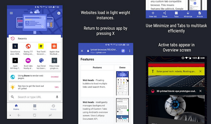 Користувальницькі вкладки можуть бути також запущено у фоновому режимі, що в цілому схоже на згорнутий чат Facebook Messenger. Lynket використовує функціонал Custom Tabs, який дозволяє застосовувати архітектуру будь-якого іншого браузера і синхронізувати з ним існуючі дані.