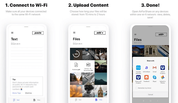 AirForShare — це додаток для швидкогообміну файлами, повідомленнями та посиланнями за допомогою Wi-Fi з'єднання. Додаток дуже простий у використанні: як тільки ви перенесіть який-небудь файл в програму, він тут же з'явиться на сайті сервісу і буде зберігатися на ньому від 15 хвилин до 2 годин, потім буде видалено.