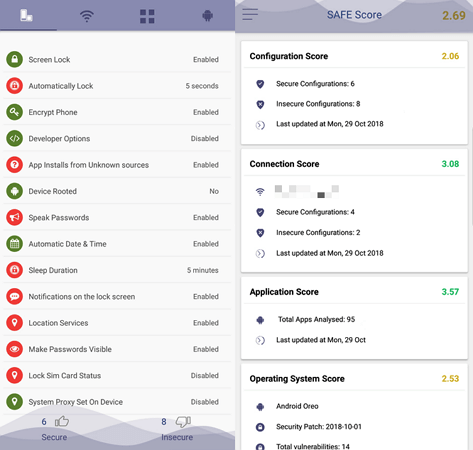 SAFE оцінює рівень уразливості пристрою за шкалою від 0 до 5. Низькі оцінки означають неправильно виставлену конфігурацію телефону. Наприклад, якщо вхід у режим сну включається не більше ніж через хвилину або якщо повідомлення відображаються на екрані блокування.