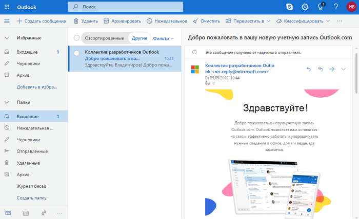 Веб-інтерфейс цього сервісу дуже чистий і функціональний. Outlook Mail може не тільки автоматично сортувати важливу електронну пошту, створювати каталоги новинних розсилок, рахунків і фотографій, але і дозволяє вам створювати свої папки і користувальницькі ярлики. Спеціальні фільтри покажуть лише потрібні вам листи і допоможуть утримувати вашу поштову скриньку в чистоті.