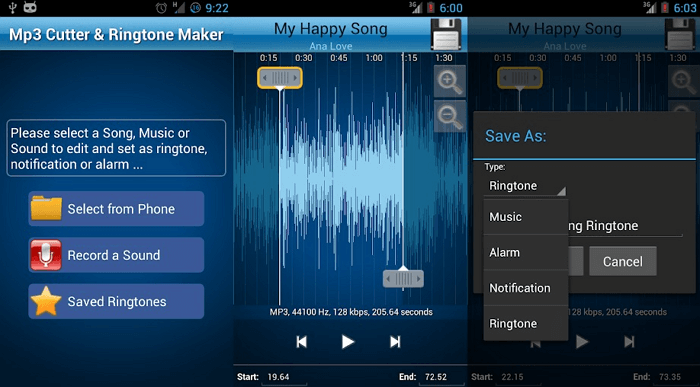 MP3 Cutter and Ringtone Makerдопомагає встановлювати MP3-файли в рингтони, звуки повідомлень або персональний сигнал будильника, що робить його універсальним в плані функціональності. Крім того, ви завжди можете використовувати вбудований рекордер для додавання унікальних штрихів до свого рингтону. Процес редагування займає не більше кількох хвилин. Від вас потрібно лише вибрати аудіофайл, обрізати його, зберегти і встановити в якості мелодії для дзвінка або повідомлення.