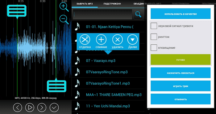 Audio MP3 Cutterбільше підійде для створення музики, ніж просто для обрізки аудіофайлів. З його допомогою ви можете також редагувати пісні і встановлювати їх в якості дзвінка або сигналу. Крім того, воно допоможе вам об'єднувати декілька мелодій в одну, змінювати метадані музичного файлу, включаючи обкладинку альбому, теги, його ім'я виконавця і т. д. Вбудований плеєр допоможе прослухати наявні записи.
