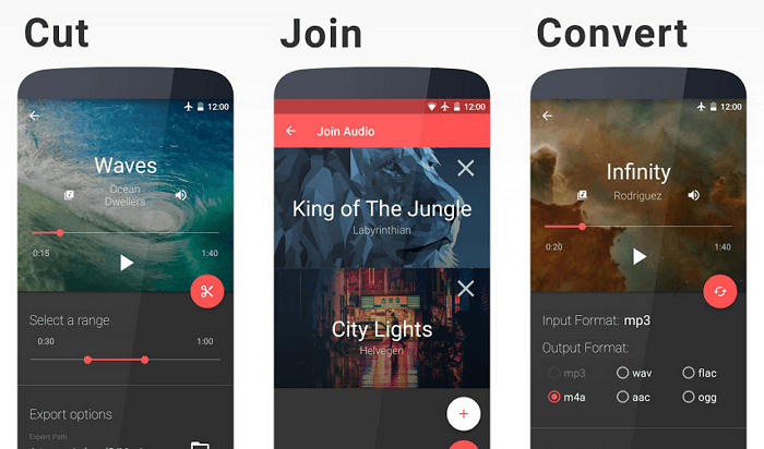 Додаток поставляється разом зі спеціальним диктофоном, завдяки якому можна записувати свій голос або музику. Music Editor також стане в нагоді, якщо ви хочете конвертувати MP3 файли в інший формат: AAC, WAV, M4A і інші.