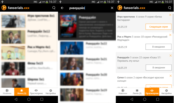 При першому запуску FanSerials користувачеві пропонується переглянути коротку інструкцію по налаштуванню, а також пройти реєстрацію або авторизацію. У нижній панелі розташовані самі використовувані вкладки: Новинки, Стрічка, Переглянуто. Варто зазначити, що пошук працює добре, підтримується введення російських і англійських назв, також присутній фільтрація контенту за популярністю, дату виходу і назві.