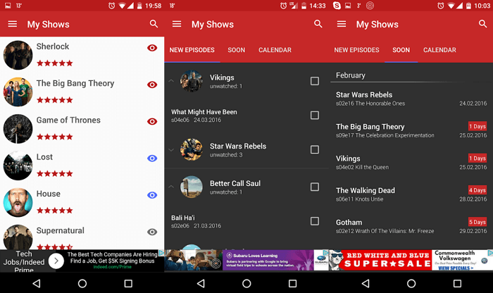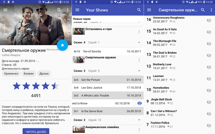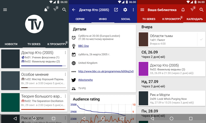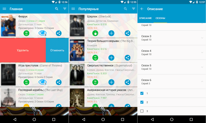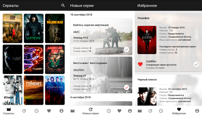 Після реєстрації ви зможете створювати власні списки з будь-якими назвами, наприклад: «буду дивитися», «закинув» або «подивився». Дуже зручно реалізований розділ з новими серіями, в якому вказується кількість непереглянутих епізодів. А також присутні нагадування, виведені на панель сповіщень або на головний екран. У вкладці з розкладом можна дізнатися графік виходу серій в найближчі дні або точну дату прем'єри будь-якого серіалу.