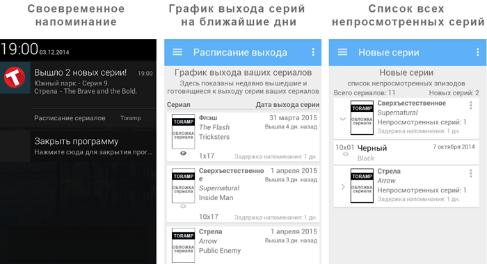 Не пропустити нові серії допоможе спеціальне нагадування, яке з'являється в панелі сповіщень смартфона за день до прем'єри. Щоб відзначити переглянутий епізод досить натиснути по галочці навпроти назви серії. У додатку показується реклама, відключити яку можна покупкою спеціальної підписки.