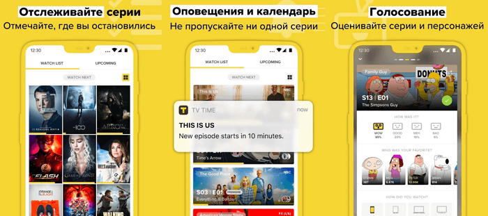 На сторінці з фільмом можна побачити його рейтинг, почитати відгуки користувачів, а також ознайомитися з акторами і анотацією. У додатку можна вибирати серіали для майбутнього перегляду, а також відзначати вже переглянуті епізоди. На відміну від своїх аналогів, програма TV Time повідомляє своїх користувачів за день до виходу нового сезону. У додатку є фільтр по популярності, дату виходу і назвою, тому проблем з пошуком не виникне.