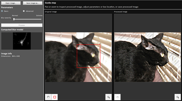 Після проходження навчання, можна приступати до обробки. Для цього необхідно помістити червоний квадрат на область з сильною розмитістю і натиснути на кнопку Process. У більшості випадків на цьому все. Якщо результати вас не задовольняють, можна перемістити квадрат в іншу область і спробувати знову. Додаток виконує свою роботу добре, йому вдалося перетворити деякі розмиті фотографії в цілком гідні.