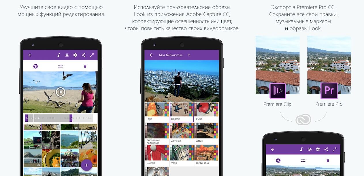 У Adobe є не тільки знаменитий фоторедактор Photoshop, але і власне мобільний додаток для створення забавних відеороликів — Premier Clip, яка дозволяє швидко створювати фільми на основі фотографій та інших медіафайлів. Можна вибрати автоматичне створення ролика або скористатися редактором, щоб налаштувати все вручну.