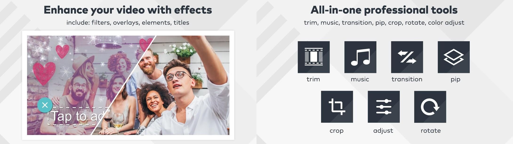VivaVideo пропонує приблизно ті ж функції, які є в описаних вище програмах. Разом з тим додаток намагається виділитися з допомогою кількох інструментів, призначених в першу чергу для миллениалов. Зокрема, сюди входить додавання смайлів, стікерів, обробка селфи-знімків і анімовані ефекти.