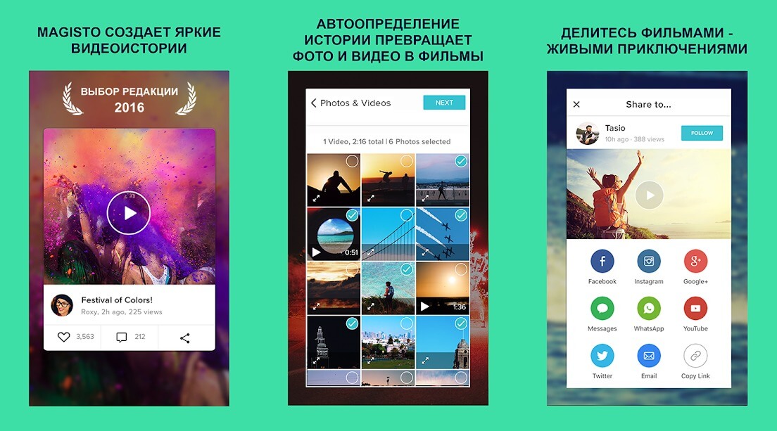 Magisto — досить складний інструмент, який вміє автоматично генерувати приємні спогади у форматі відео з зображень та інших файлів користувача. Одне з головних переваг Magisto — розпізнавання осіб, завдяки чому програма автоматично визначає найбільш важливі кадри, враховуючи це при створенні кліпу.