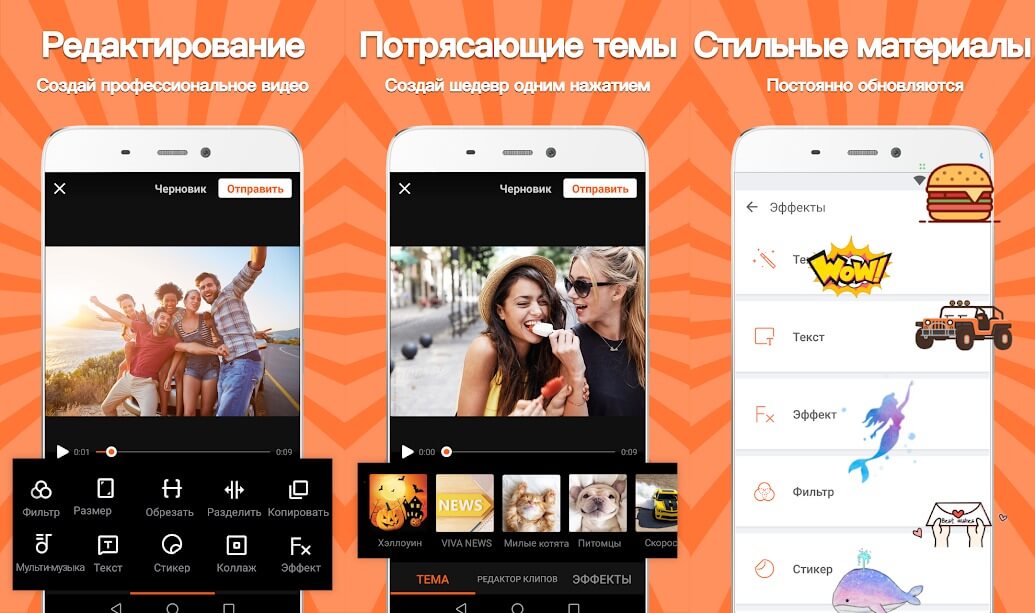 У VivaVideo ви знайдете безліч яскравих і веселих тим, які підійдуть для відео різних жанрів. Готові ролики можна швидко експортувати в Facebook, Telegram, інші сайти безпосередньо зі смартфона.