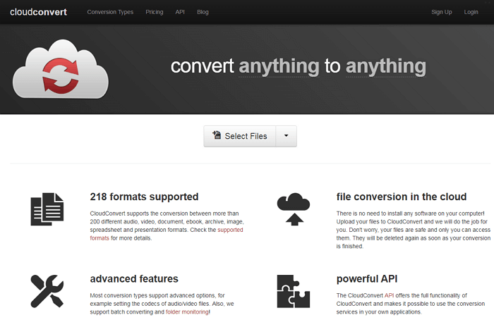 Cloud Convert — один з кращих онлайн-інструментів для завантаження і конвертації файлів. В даний час він обробляє 214 різних форматів. На сервісі ви також отримаєте можливість працювати з документами, зображеннями, електронними книгами і т. д. Присутній пакетна конвертація.