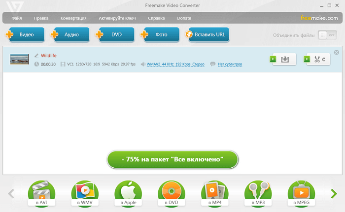 Freemake Video Converter — ще один відомий конвертер, швидкий, гнучкий і легкий у використанні. Підтримує більше 500 форматів і дозволяє завантажувати ролики безпосередньо з соціальних мереж і популярних інтернет-сервісів. Вміє працювати з безліччю пристроїв та з роздільною здатністю 4K.