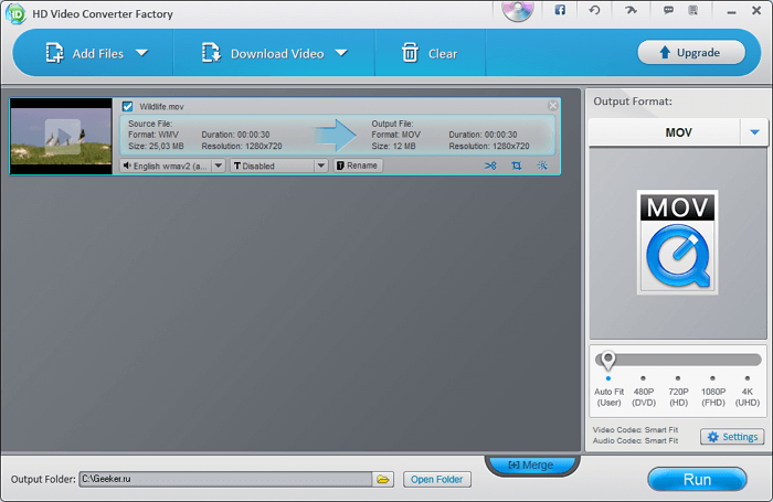 HD Video Converter Factory — щось більше, ніж просто помічник для зміни формату відео. Програма також включає в базовий набір функцій для редагування. Розробники настільки впевнені в простоті додатки, що на офіційному сайті міститься всього 10-секундний ролик для новачків. Ви можете перетягнути потрібний файл у вікно програми або ж вибрати ролик для завантаження потрібного пристрою.